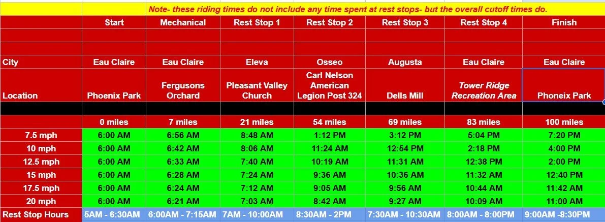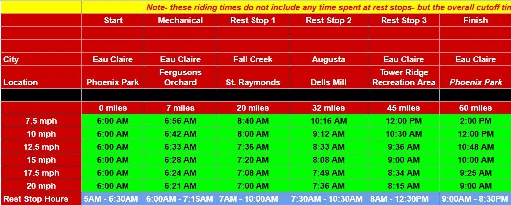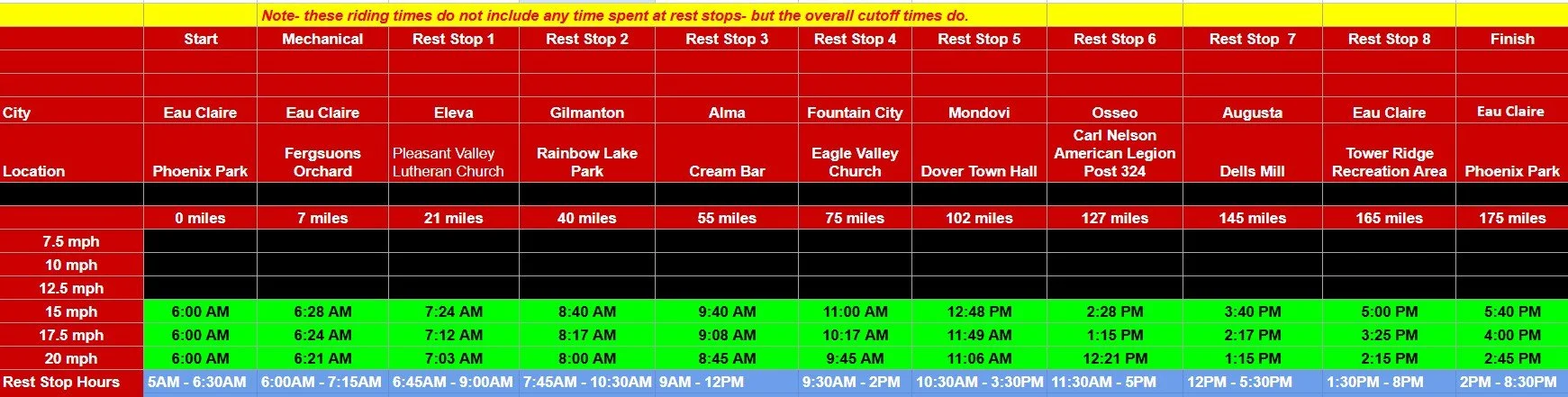 Above is a schedule of when rest stops will be available to riders. Please note the cutoff times and required minimum average speed to meet these. People who do not make the cutoff times will be sagged.